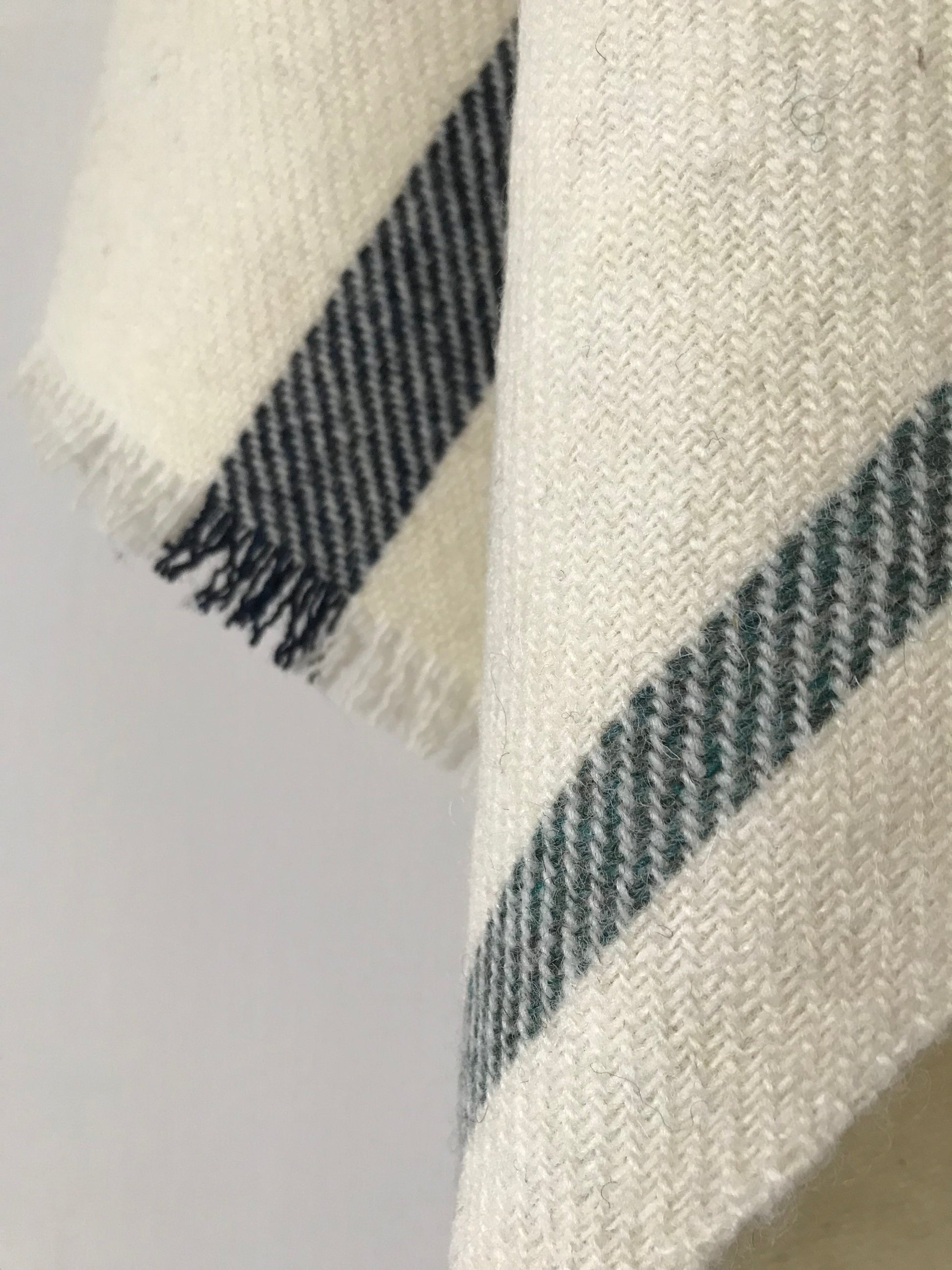 A woven Shawl, woven on my MK2 Hattersley loom on the Isle of Harris, Scotland. Woven using a British Breed pure wool yarn in both dyed and undyed shades of cream, green, brown and navy blue.
